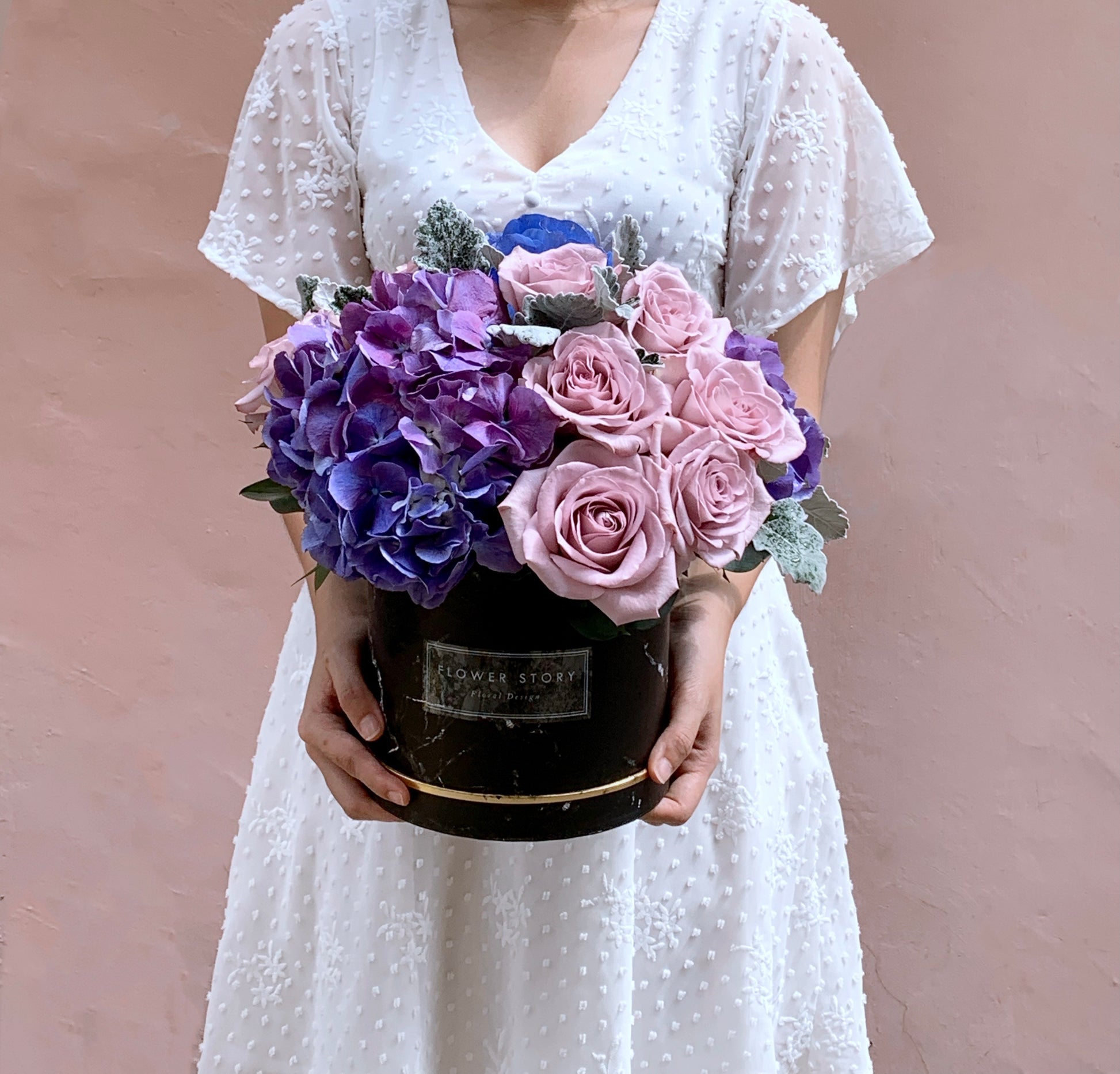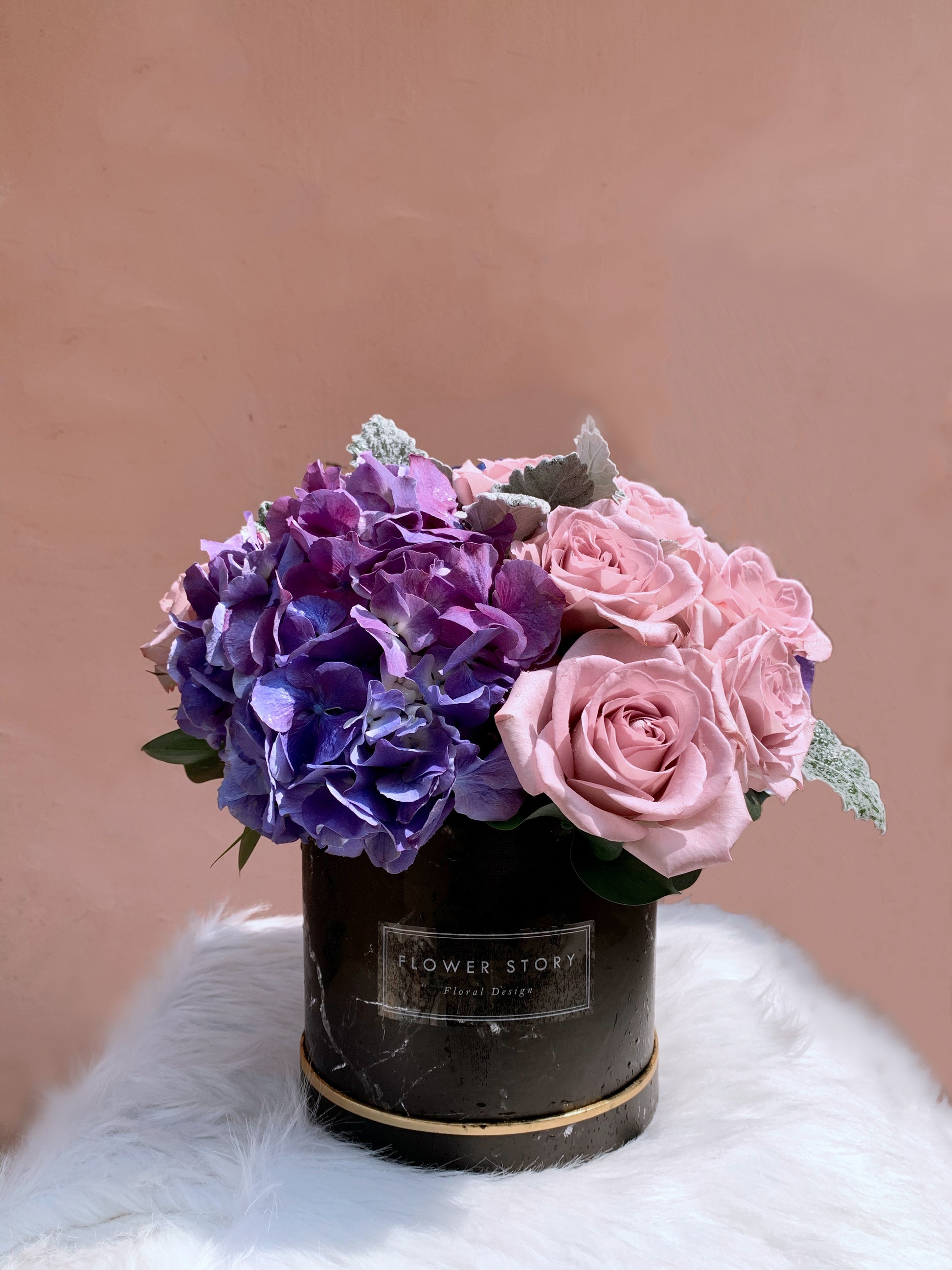 Our box arrangement of purple hydrangeas & roses for those who can't get enough of purples.